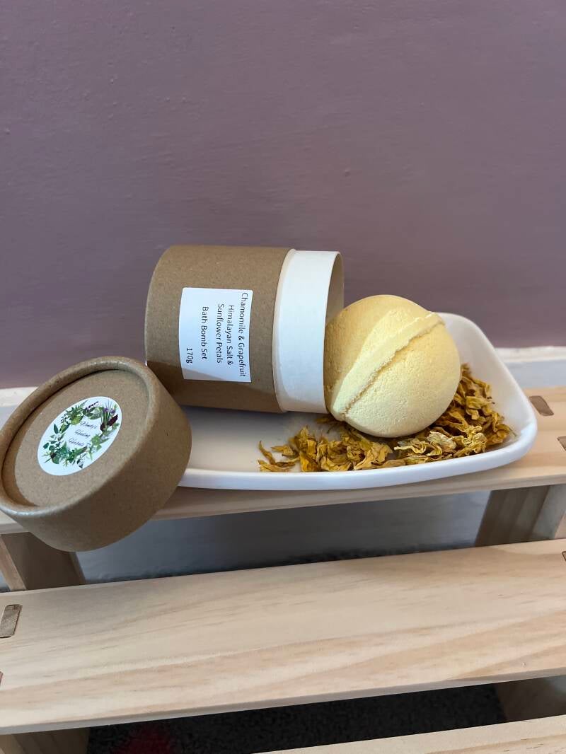 A bath bomb set comprising a Rosemary and Thyme bath bomb, Himalayan salts and Sunflower petals presented in an eco friendly cardboard container. Rosemary and thyme are both known for their ability to cleanse and purify the skin.A refreshing and rejuvenating experience.Mineral rich Himalayan salts and Sunflower petals and grapefruit for brightness and scent.140g.